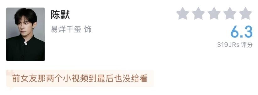 此次饰演初入隐蔽战线的国安新锐陈默,以6.3分位居中段,既非高光闪耀,亦非明显短板。