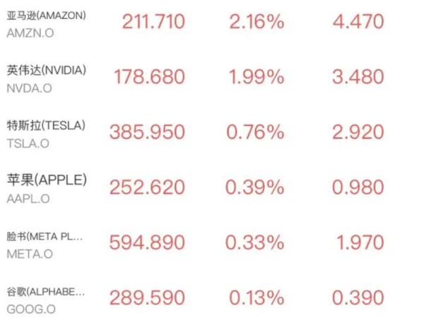 明星科技股涨多跌少,亚马逊涨2.16%,特斯拉涨0.76%,苹果、Meta涨幅均超过0.3%,不过微软跌近0.5%。