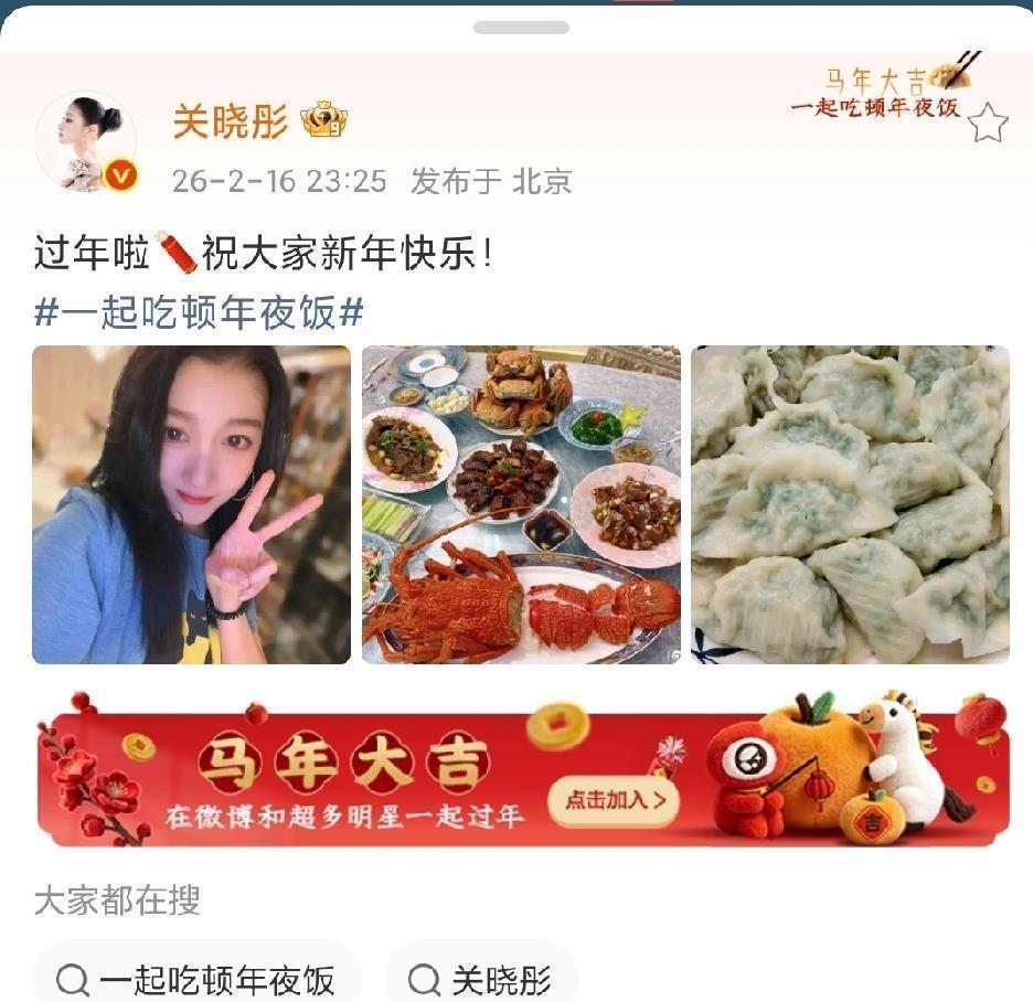 关晓彤在大年三十晚上发了微博。她放了一张自己笑着的照片,还有两张年夜饭的图。饭桌上有龙虾和鲍鱼,还有些别的菜。有人看了就说,这像是她家会吃的东西。