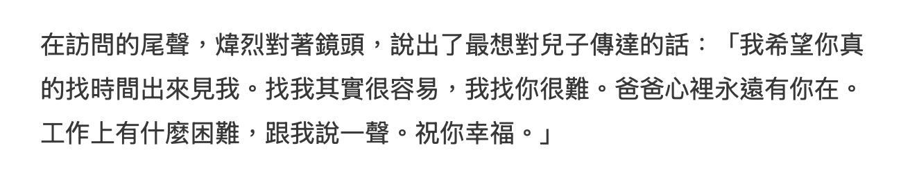炜烈受访谈及了人生的两大遗憾,第一大遗憾就是妻子的离世,未能与之白头到老,而第二大遗憾就是与亲生儿子仍然未能相认。过去的2025年,炜烈最轰动的新闻就是与亲生儿子相认,这本是一场全场瞩目的父子相认过程,却因为儿子的临阵退缩而告终,距今儿子拒绝与他相认,时间又过了半年。这半年炜烈一直耿耿于怀,有一种不可名状的心情,借着访谈,他不介意对着镜头公开喊话儿子,希望儿子能够找时间出来见自己。他称儿子找自己很容易,然而自己找儿子很难,并表示心中一直有儿子,如果儿子工作上有困难,可以与自己说,最后还祝福儿子幸福。